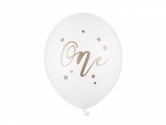Красиви бели латексови балони със златен надпис ONE и златни звездички , за надуване с въздух и хелий. Цената не включва надуване с хелий. Размер: 30см. Брой в опаковка: 6бр Моля изберете желаната от вас бройка. Купи изгодно!!!